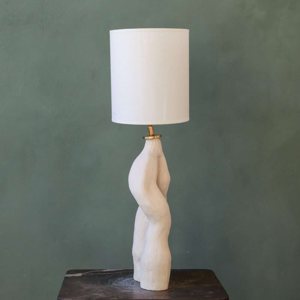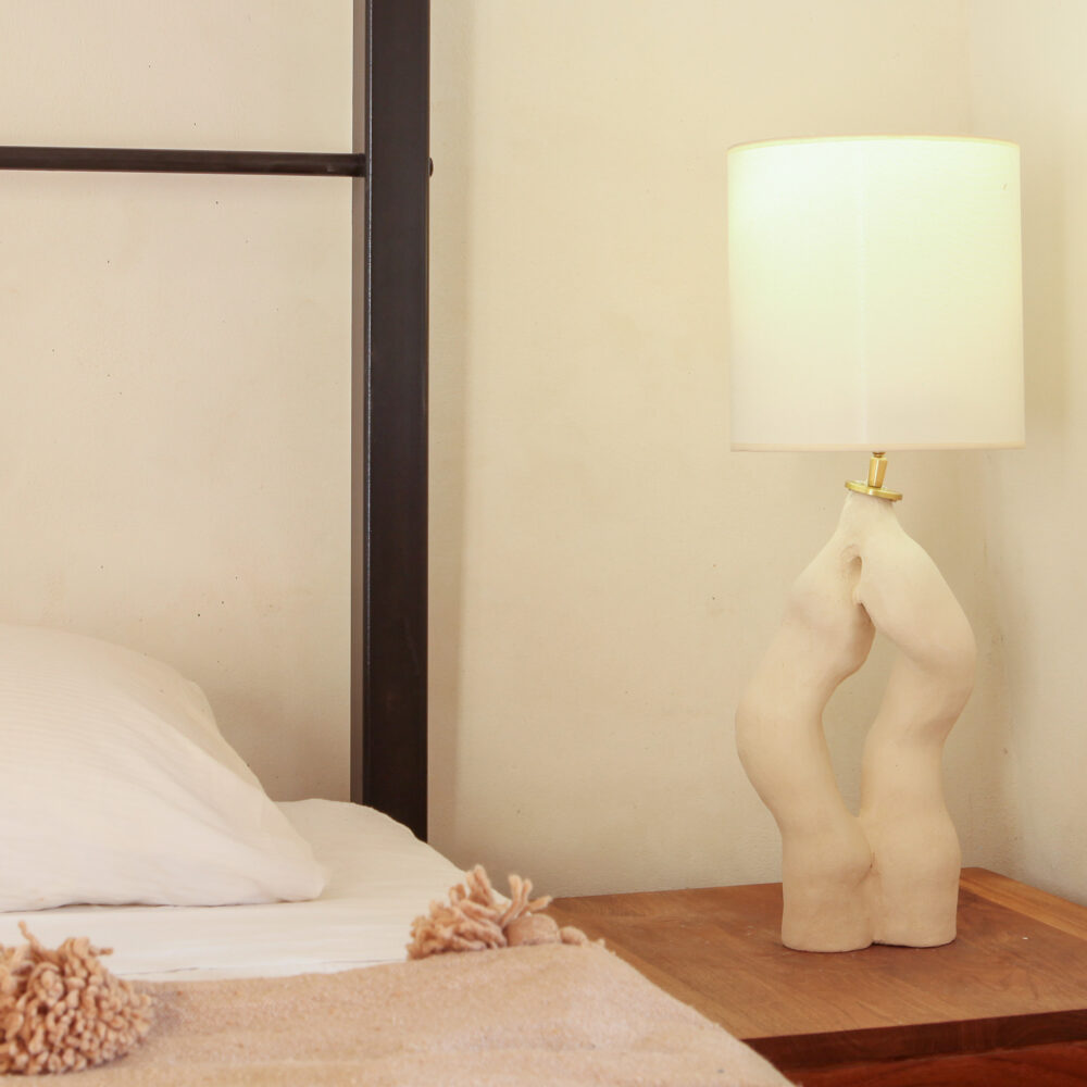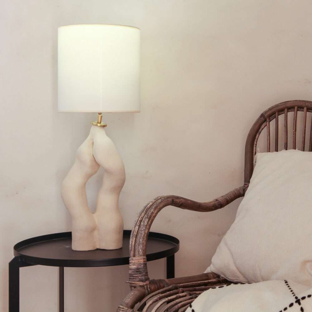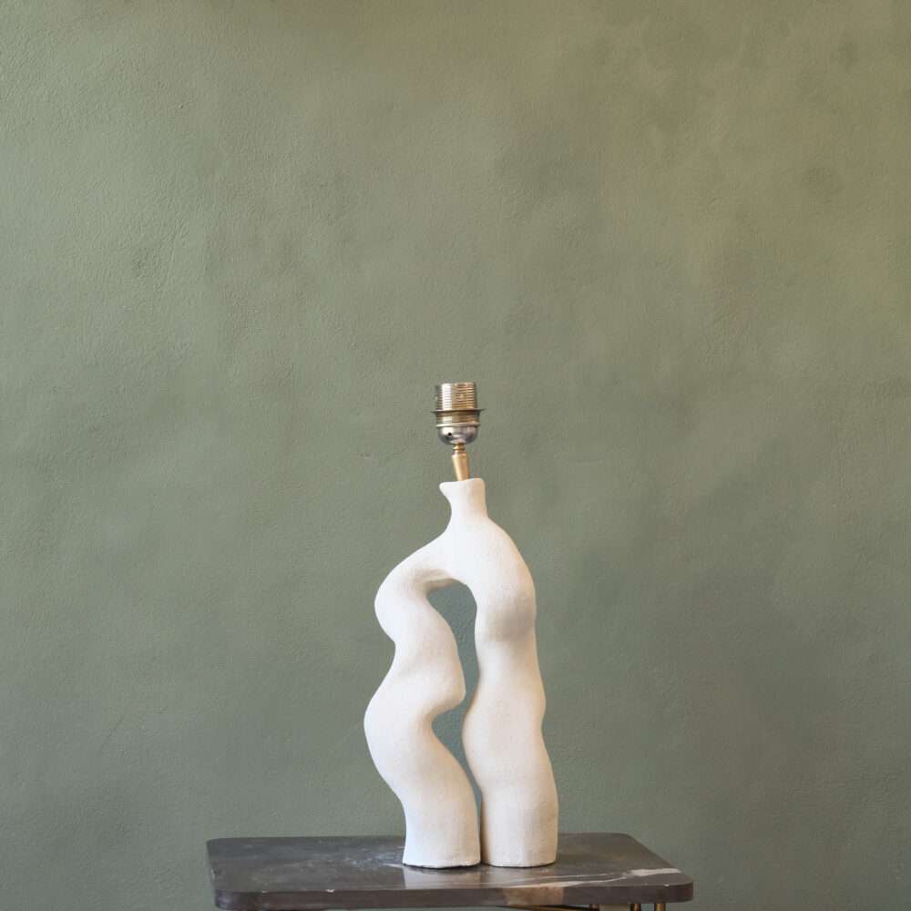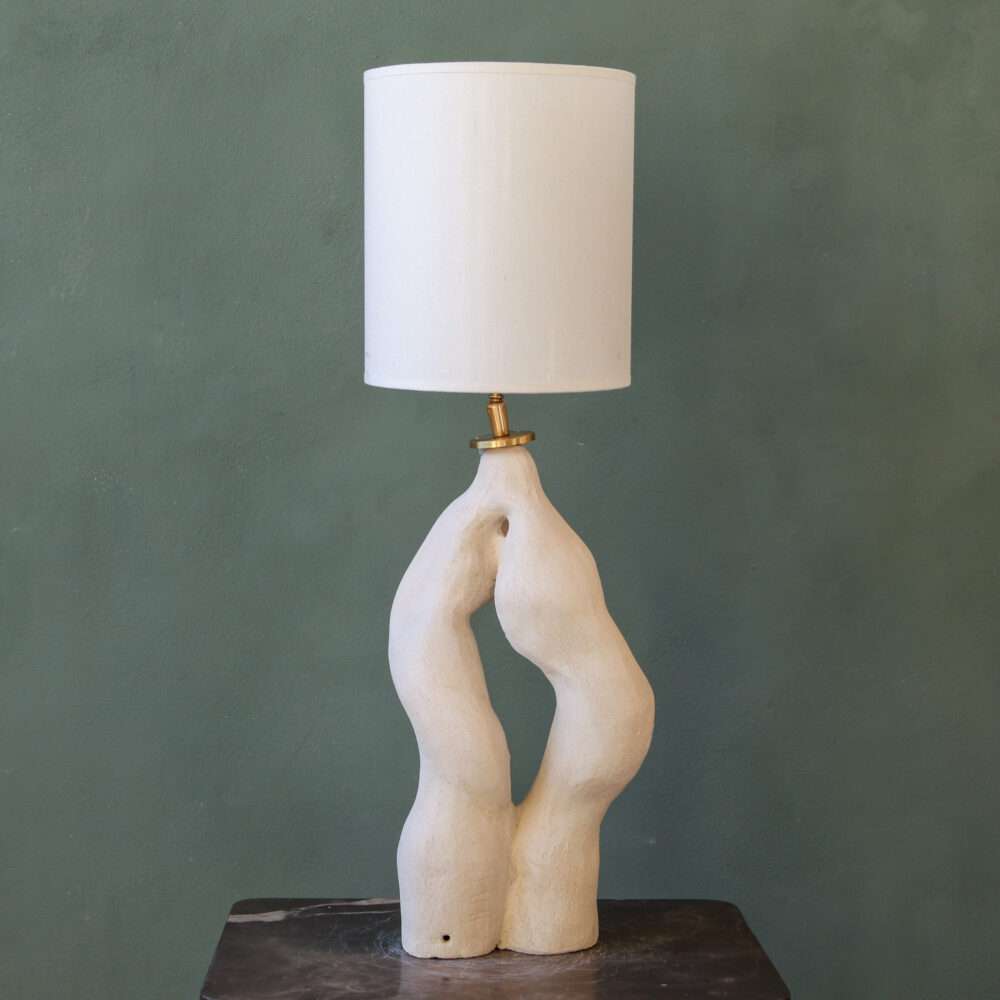 Roots handmade organic lamp. Hand-sculpted in white, unglazed ceramic. The Roots lamp embodies the organic elegance of nature. Its winding, root-like form seems to grow and intertwine, capturing the quiet strength of what lies beneath the surface. Each curve is shaped by hand, making every piece unique.