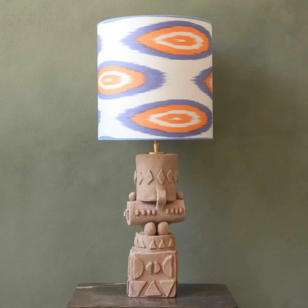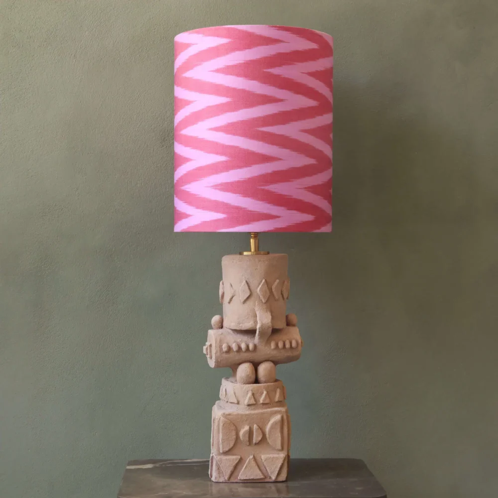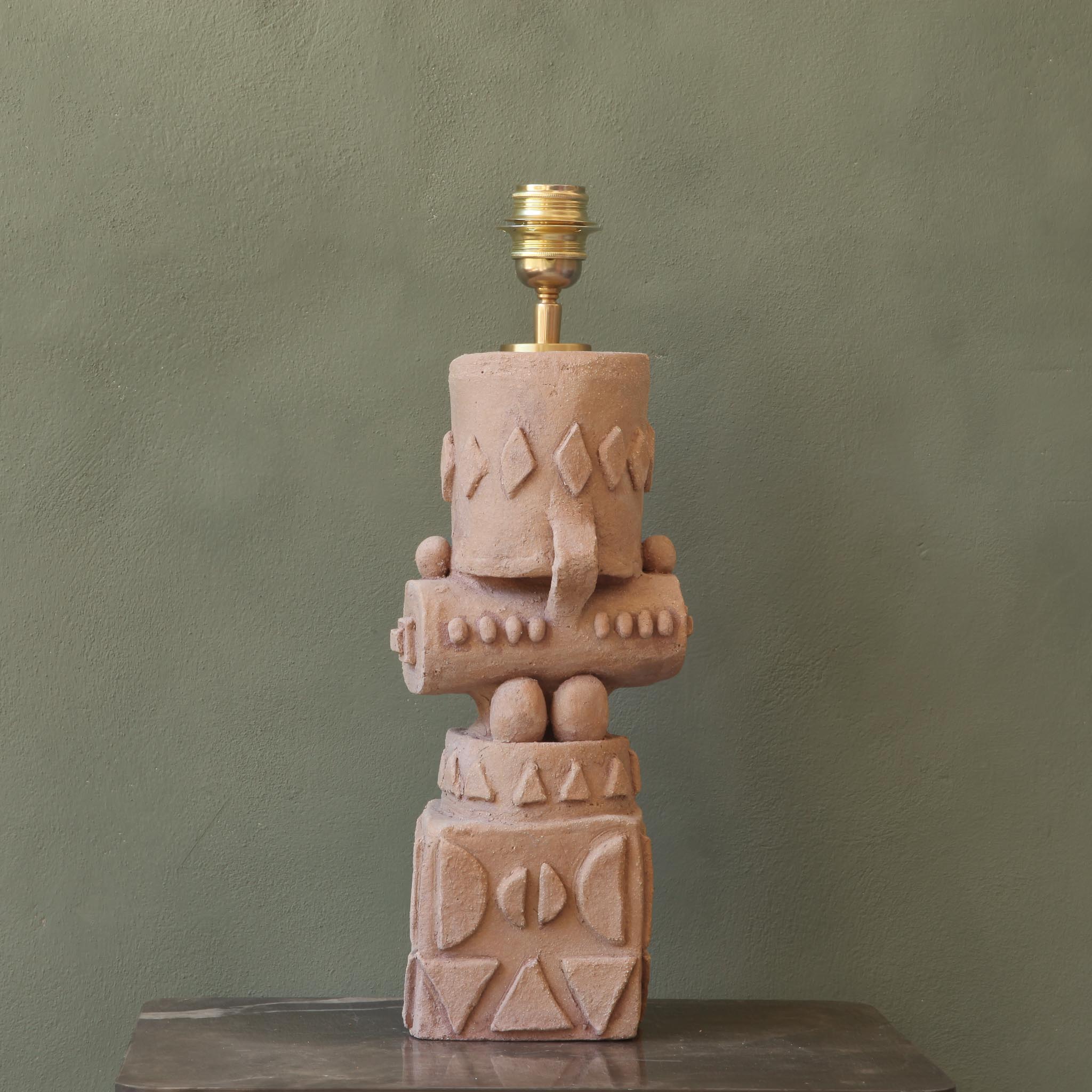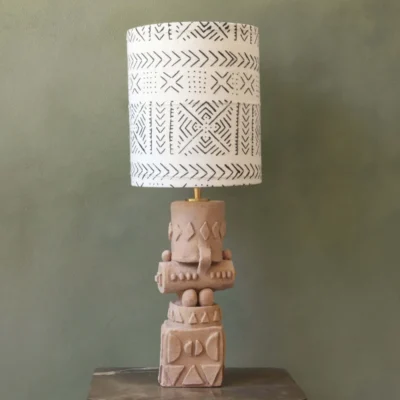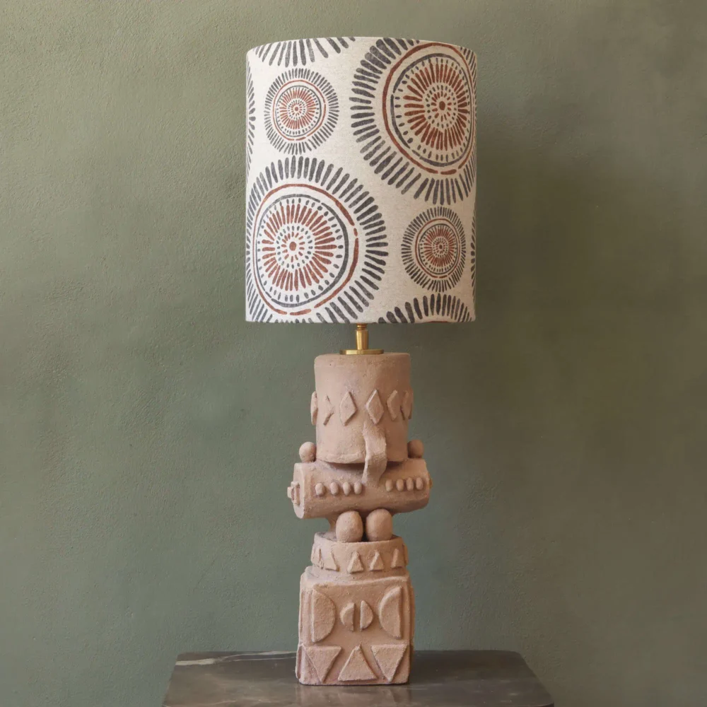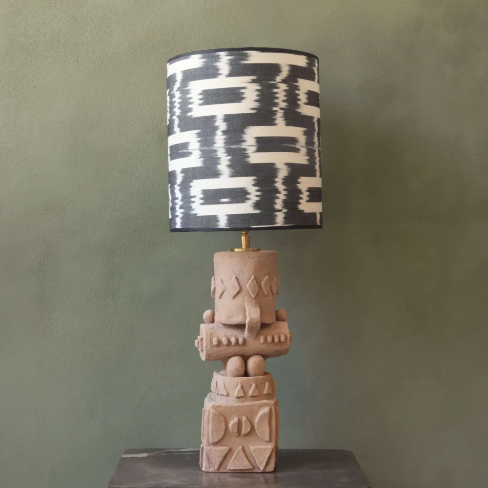 Totem handmade ceramic bohemian table lamp in terra. Handcrafted in raw brown clay, the Totem lamp stands tall and grounded—an earthy, sculptural statement that brings balance and strength to any space.